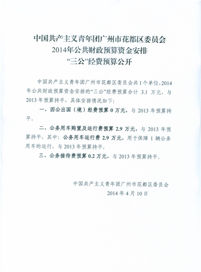 中國共產主義青年團廣州市花都區委員會2014年“三公”經費預算