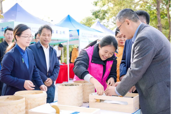 舞臺一側的文明集市,成為活動現場最具人氣的焦點。十個特色展位依次排開,各具特色:梯面山水農產品展現綠色生態發展理念,蝴蝶谷文創將傳統工藝與現代設計相融合,客家嫂手工制品傳承匠心技藝。一位正在制作艾糍的村民笑著說:“我們的手藝能受到這么多人喜愛,感覺特別自豪。”現場還設有織布、手編等互動體驗區,參觀者通過參與織布、手編制作等互動項目,在實踐體驗中深化對傳統文化的認知。這場集產品展銷、文化體驗、互動交流于一體的文明集市,既是梯面特色產業創新發展的生動展示,更是“百千萬工程”建設成果惠及民間的真實寫照。