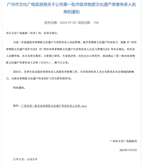 2024年4月,廣州市文化廣電旅游局組織開展市級非物質文化遺產榮譽傳承人推薦申報工作,經自主申報、各區推薦、專家組評審、社會公示等程序,認定10位市級代表性傳承人為第一批市級非物質文化遺產榮譽傳承人,我區市級非遺代表性傳承人劉土金、譚秋榮入選。