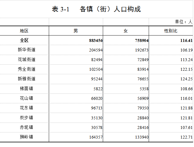 根據第七次全國人口普查結果,現將2020年11月1日零時我區10個鎮(街)的人口性別構成情況公布如下: