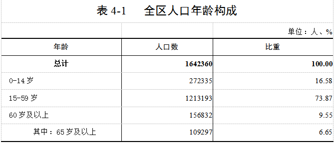 全區常住人口[2]中,0-14歲[3]人口為272335人,占16.58%;15-59歲人口為1213193人,占73.87%;60歲及以上人口為156832人,占9.55%,其中65歲及以上人口為109297人,占6.65%。與2010年第六次全國人口普查相比,0-14歲人口的比重提高4.52個百分點,15-59歲人口的比重下降4.70個百分點,60歲及以上人口的比重提高0.18個百分點,65歲及以上人口的比重提高0.45個百分點。