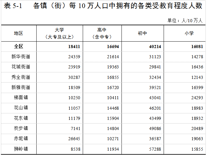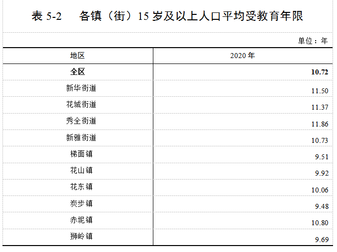 與2010年第六次全國人口普查相比,全區常住人口中,15歲及以上人口的平均受教育年限由9.72年提高至10.72年,10個鎮(街)中,6個鎮(街)平均受教育年限在10年以上。