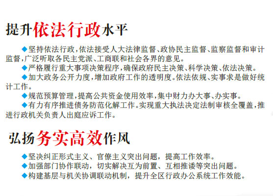 完成既定目標,關鍵在于落實。我們將不忘初心、牢記使命,狠抓落實,努力打造“公平正義、依法行政、務實創新、高效廉潔”的人民政府。