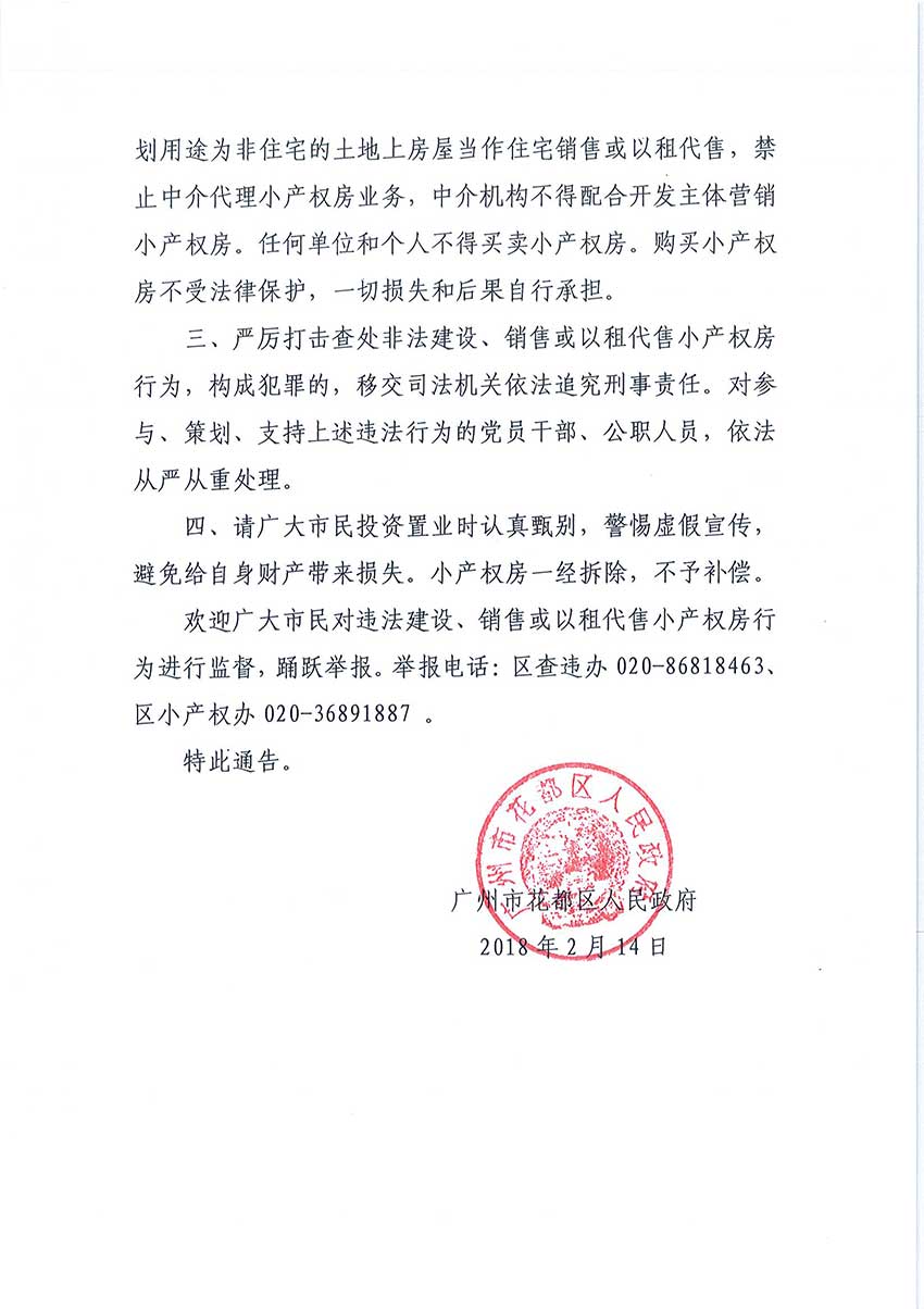 廣州市花都區人民政府關于堅決遏制非法建設、銷售或以租代售小產權房的通告【花府〔2018〕3號】
