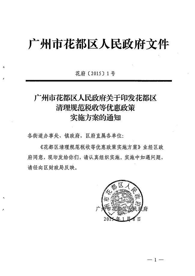廣州市花都區人民政府關于印發花都區清理規范稅收等優惠政策實施方案的通知 【花府[2015]1號】