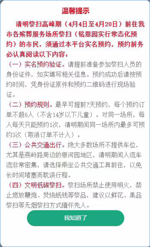 銘恩園(原市火葬場)實行常態化預約,非上述時間前往祭掃的市民,請關注“銀河園”微信公眾號預約辦理。