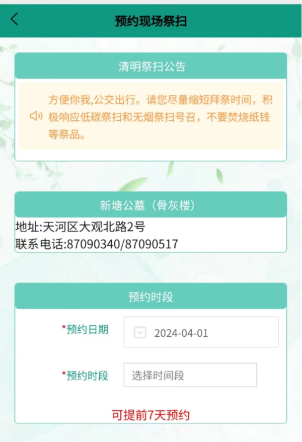 4月4日至4月20日,到廣州市轄區內殯儀館、公墓、骨灰樓(堂)等殯葬服務場所現場祭掃,須辦理網上實名預約登記。通過 “廣州民政”或“穗好辦”微信公眾號進入“廣州市清明祭掃網上預約平臺”,可提前7日預約祭掃時段。