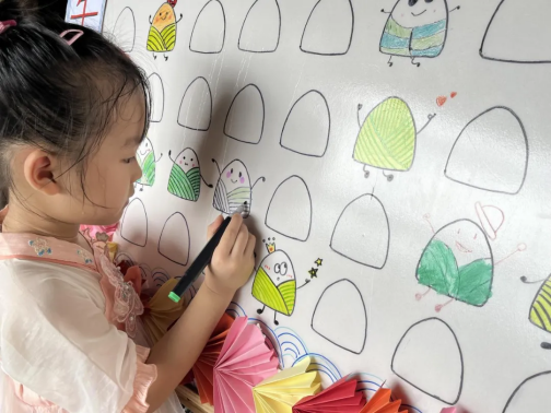 一到現(xiàn)場,孩子們就在簽到墻上手繪創(chuàng)意粽子,以獨(dú)特的方式簽到,畫出的粽子各有神態(tài),有的唱歌、有的跳舞、有的玩耍……表達(dá)孩子們過端午節(jié)及參加活動愉悅的心情。